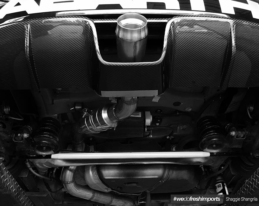 En el aspecto exterior, todos los añadidos son de fibra de carbono del fabricante Vanhook, que curiosamente la marca pertenece a un amigo suyo. El difusor trasero, también en fibra de carbono, es obra de Madness Autoworks.
