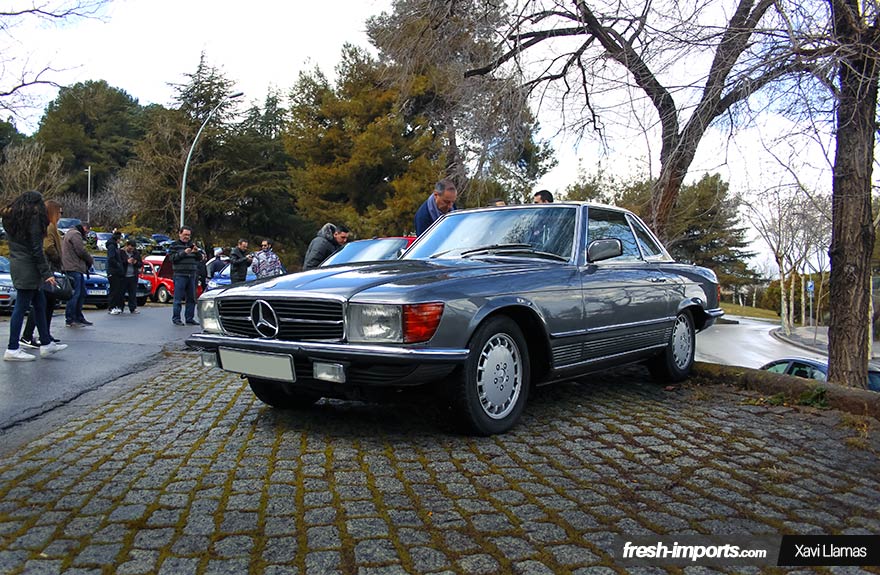 En esta quedada de clásicos de Montjuic no faltó tampoco el sucesor del conocido Mercedes SL “Pagoda”. El SL W107 es una carrocería muy bonita y que se está revalorizando rápidamente.