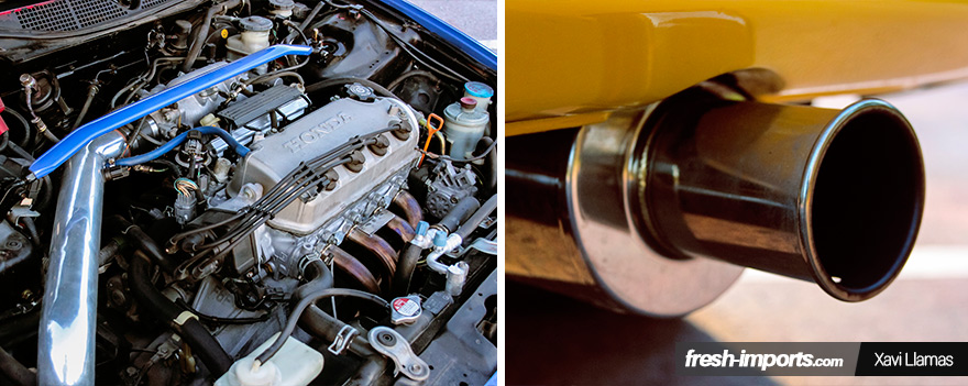 A parte de las llantas, estéticamente también tiene tela, supongo que lo habréis apreciado. El alerón trasero es una réplica del modelo Spoon en fibra de carbono, igual que el lip, pero sin estar fabricado en este ligero material. A pesar de no verse, el interior también tiene varias mods como el pomo de aluminio Spoon Sports original y el volante de Accord CL1 Euro R. Próximamente se le montarán los semi-buckets réplica de Recaro y los relojes Depo 3en1, muy útiles por cierto, ya que te proporcionan información a tiempo real de las temperatura de agua y aceite así como de la presión de éste último.