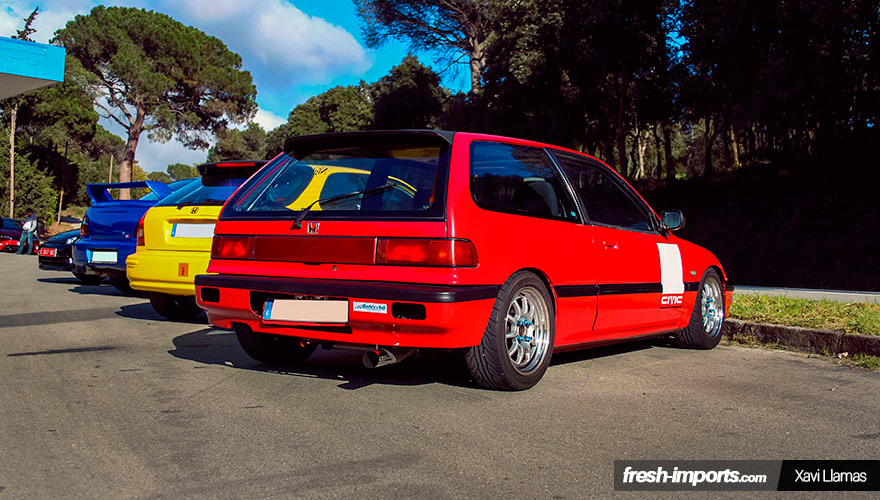 Los modelos que posaban ante la cámara no se quejaban. Aquí tenéis en línea el Civic 4th, el EK3 con decoración Spoon, el Subaru Impreza STI y un poco de morro del Toyota Soarer.