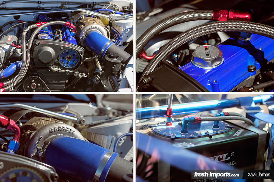 Lo cierto es que no queda mucho de aquel bonito Nissan S13 blanco con vinilos dorados. Bueno si, el color blanco y el chasis, porque las modificaciones que se le han hecho a este coche han sido infinitas.
