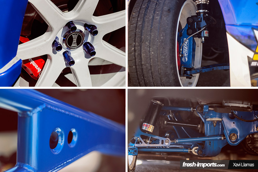 Claro que para la potencia tan bestia que entrega el propulsor turboalimentado de 2.5L de origen Nissan, necesitamos la máxima seguridad. Siempre recordamos aquel slogan tan técnico de: “La potencia sin control no sirve de nada“. Bien, para eso, tanto en la parte delantera como en la trasera, monta las famosas mejoras de suspensión Wisefab. Delante le confiere libres movimientos a la hora de alinear y un ángulo de giro de a partir de 55º. La parte trasera da rienda suelta a la caída, convergencia y divergencia, con tal de obtener el alineado perfecto. Los Frenos Brembo de 4 pistones son los encargados de parar esta máquina crea nubes.