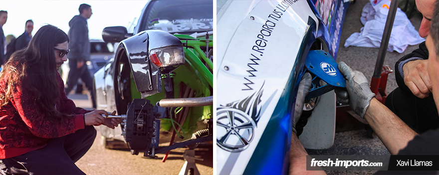 Al salir de pista pudimos merodear por el paddock con total tranquilidad mientras la Nascar Euro Wheelen estaba en pista hasta las 18.10 PM. Allí vimos a todos los participantes, nos contaban sus reacciones y problemas, como por ejemplo Joan Caballer, que detectó un extraño sonido en la parte delantera izquierda de su Nissan S13 con RB25DET. Nada importante, el amortiguador, que por cierto era nuevo, no estaba ajustado como debería. Un trabajo que en poco más de 15 minutos se solucionó.