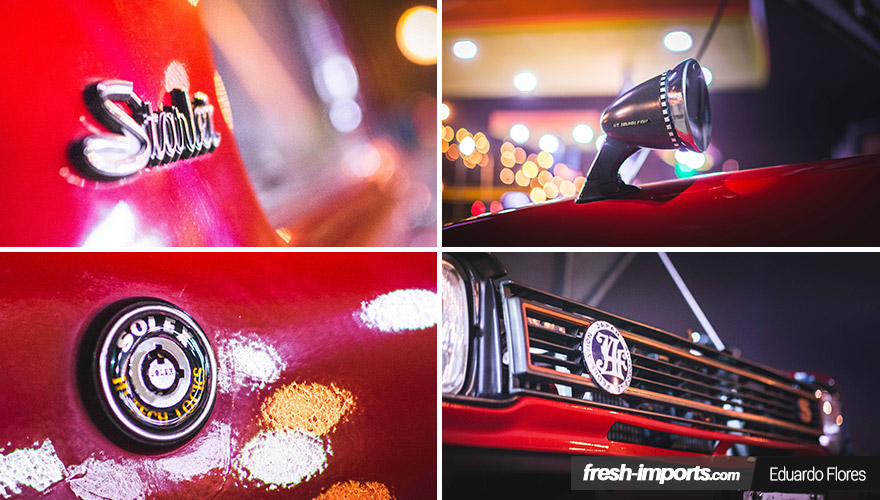 Yoshio tiene claro que los pequeños detalles son los que marcan la diferencia, por ello conserva de forma impoluta los emblemas originales del Toyota Starlet. Sustituyo los viejos retrovisores del coche por unos Napoleón GT Racing de lo más vintage que realzan su faceta más clásica, además de sustituir los bombines de las puertas por unos Solex Hi-Tech Locks.