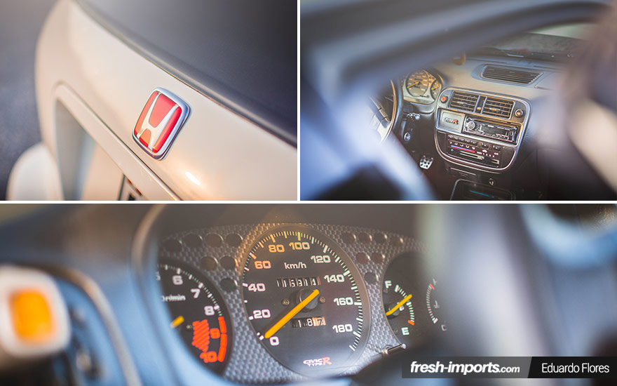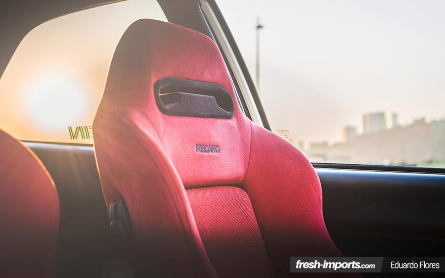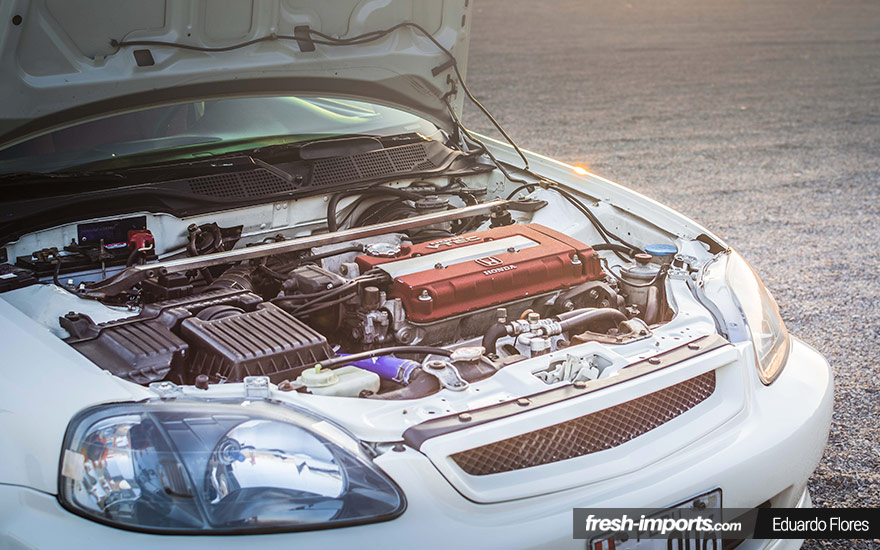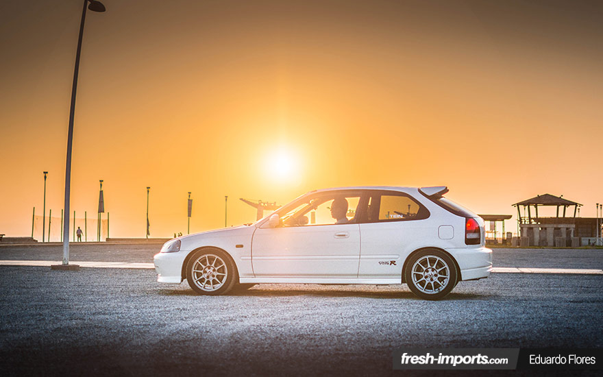 De entrada el Honda Civic ek4 lucía una pintura plateada y unas sencillas llantas, cosa que no lo hacía destacar en ninguno de los sentidos. Pero Felipe tenía claro lo que quería. Junto con un mecánico se pusieron manos a la obra y compro los bujes del Integra ek9, ya que el ek4 lleva bujes en 4×100 y el quería que fuesen 5×114. Luego compro el alerón, varias piezas más importadas directamente de USA y de Japón y pintó el coche en blanco type R. Reconoce que no dudo entre el amarillo o el blanco final. ¿Vosotros por cual os hubieseis decantado?