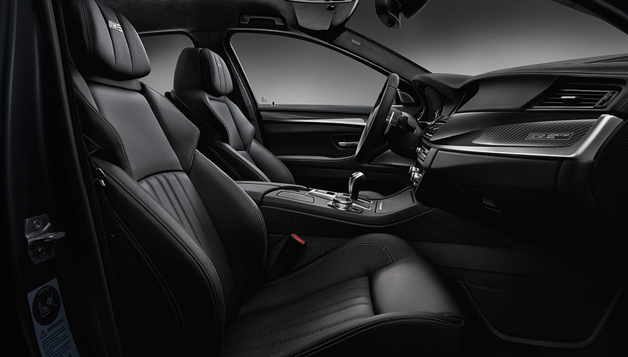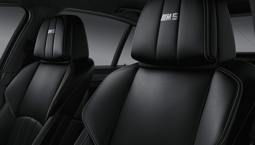 La tapicería interior en cuero Merino Black es también parte del pack y viene con costuras en color Opal White, al igual que el bordado de M5 de los reposa cabezas.