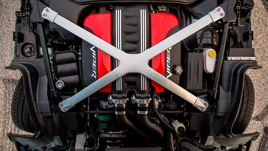 El motor ha sido preparado con dos turbos, un intercooler, inyectores de alto flujo de combustible, un sistema de escape de acero inoxidable de tres pulgadas de diámetro y una actualización del sistema de gestión de la ECU. Todo esto, consigue que el motor V10 8.0 del Dodge Viper original desarrolle una potencia de 1.000 cv. Si, 1.014 para ser exactos.