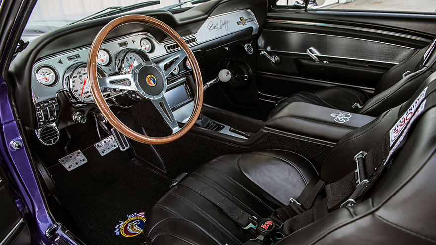 En el interior se han realizado unas cuantas personalizaciones, como por ejemplo los asientos, que están instalados unos 38 cm más bajos de lo normal para proporcionar algo más de espacio libre entre la cabeza y el techo. El reposabrazos tiene bordado un símbolo que pertenece a la familia del jeque. También cuenta con un sistema de audio que corre de la mano de JVC y Kicker, mientras que los nuevos indicadores tienen la firma de Carroll Shelby.