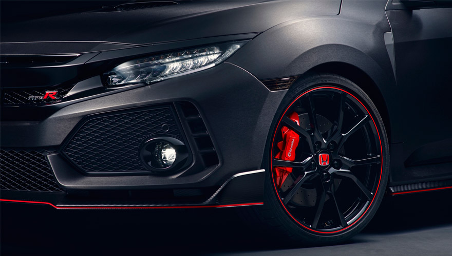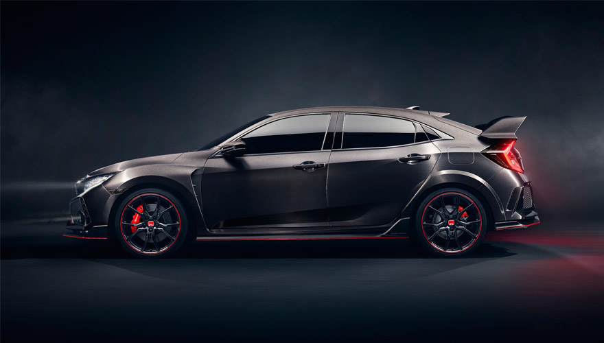 Normalmente los prototipos de Honda se identifican por ser casi clones de los coches de producción posteriores, lo vivimos con el Honda NSX, lo vivimos con el Civic Type R y ahora lo volvemos a vivir con este nuevo Honda Civic Type R Coupé. El exterior ya nos indica que no estamos frente a un “simple” Honda Civic SI. Una defensa delantera muy agresiva, enormes llantas de 20 pulgadas con neumáticos con 245mm de ancho y de alto rendimiento, la agresiva entrada en el capó, el gran alerón trasero… Es una máquina más cercana a los gustos de personas que compran coches como el Focus RS o el VW Golf R a pesar de no ser tracción integral.