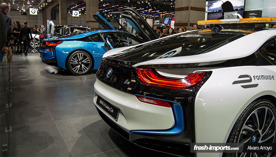 Lo primero que pudimos ver era la gama i de BMW, los coches que tienen tecnologías híbridas o totalmente eléctricas como el i3, también presente. Aunque nos llamaron más la atención los i8 allí expuestos, sobretodo este primero, que era el safety car de la Formula E.