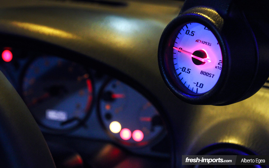 Para ello, ha sustituido varios componentes, entre los más destacables encontramos unos inyectores de 740cc, un turbo GT2860R, colectores, intercooler Blitz, filtro K&N, Rocker Stoppers Tomei… Para que todo esto estuviera afinado, se puso en contacto con Greg de ProTuner para un mapeado acorde.