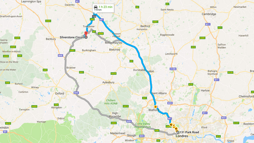 Llegar a Silverstone desde Londres fue toda una aventura. Para mí, alquilar un coche y circular por el lado contrario ya lo era, así que la emoción fue doble. Salí desde la estación de trenes de St Pancras International (allí recogí el coche sin problemas). Hice un recorrido de aproximadamente 120 kilómetros hasta llegar a Silverstone. El 75% del recorrido fue autopista, el otro 25% en carretera y ciudad.