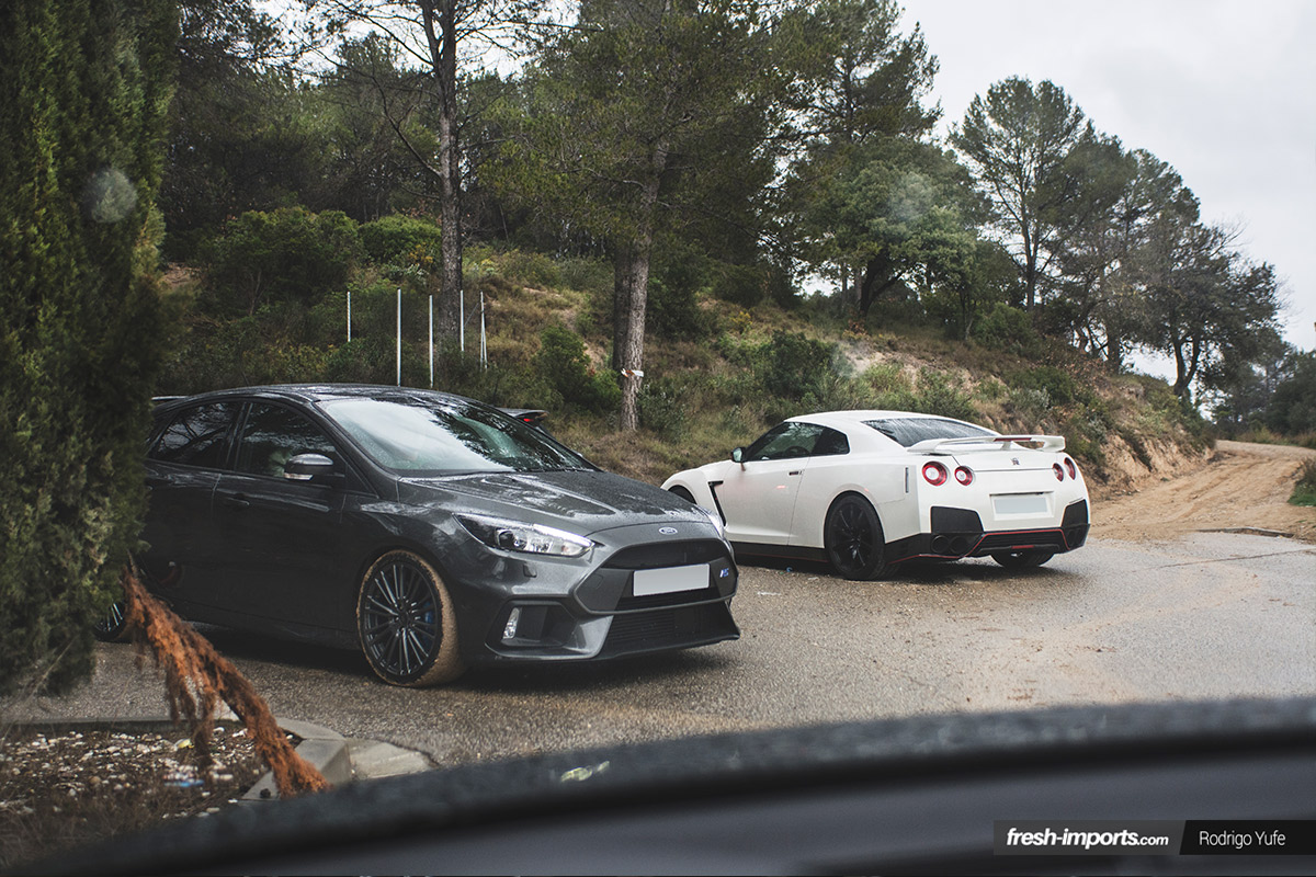 Para poner un ejemplo de comparativa real con otro coche que podéis ver en esta imagen superior, en un tramo de curvas el GTR 35 se desliza notablemente de la parte posterior, mientras el Ford Focus RS circula clavado al suelo. Alex afirma que no se nota en ningún momento que el coche pierda adherencia alguna.