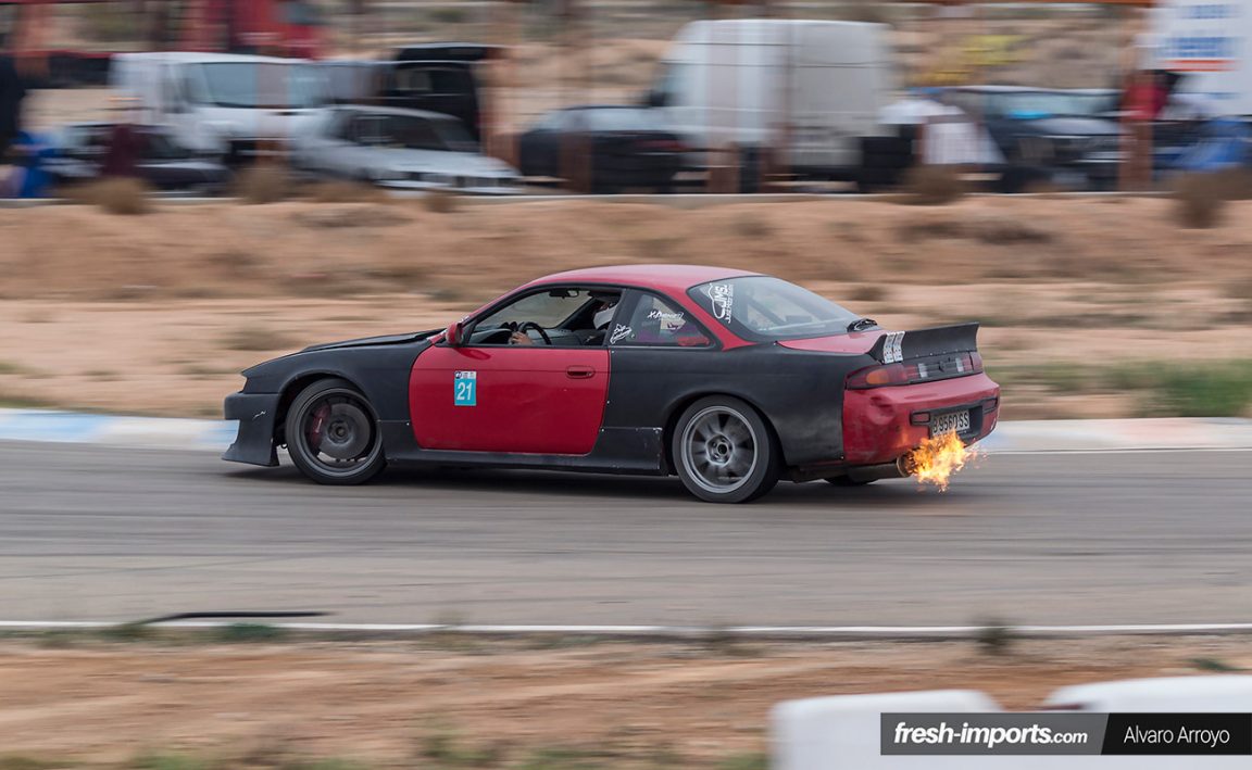 El sol cayó rápidamente, la luz se volvió amarilla intensa hasta llegar más tarde, como veréis a continuación, a naranja, y es algo que quería aprovechar. El buen ambiente el pista, como veis seguía presente a pesar del cansancio acumulado que llevábamos todos encima. Me incluyo porque gracias a la amabilidad de dos pilotos pude probar las dos variantes de coches con las que es común encontrarse en una tanda de drift como esta. Uno un BMW 325i aligerado al máximo y con kit Wisefab. Otro un Nissan S14 con aproximadamente 300cv y alguna que otra mejora en el sistema de suspensión y dirección, así que todo no consistió solo en hacer fotos.